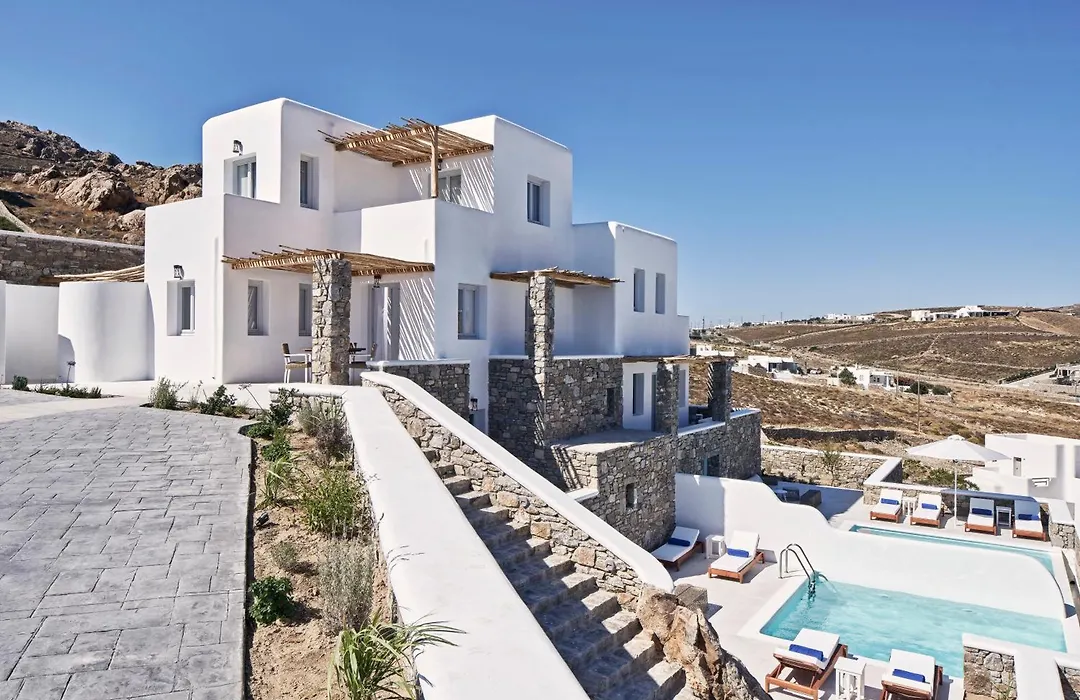Katikies Villas Mykonos offre le camere con una vista sul mare in prossimità di Spiaggia Paranga.